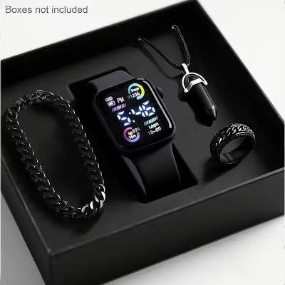 покрытие > Аксессуары > 4 предмета, набор мужских цифровых светодиодных электронных часов, ожерелья и кольца - стильные умные часы с подходящим браслетом, совместимы со смартфонами / планшетами / ноутбуками - подарок на день рождения / Рождество / День святого Валентина для него / для нее