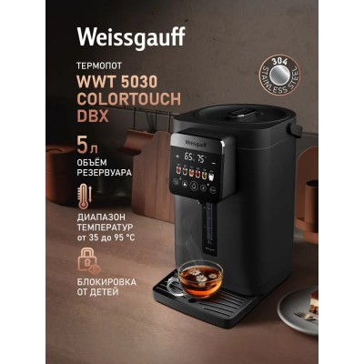 покрытие > бытовая техника > Weissgauff Термопот электрический 5л WWT 5030 ColorTouch DBx, Температура от 35 до 95 градусов C, Поддержание температуры, Функция дехлорирования, Сенсорное управление, Блокировка от детей